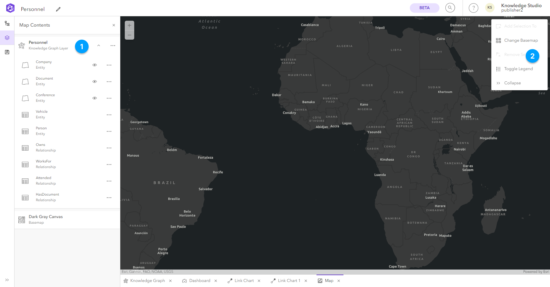 You can create a blank map from the Investigation Contents pane or you can start from any of the views in which you work with a knowledge graph: link charts, the knowledge graph view, data cards, global search and other maps. You can select entities and relationships in the active view and add them to a new map. After adding content from a knowledge graph to a map, use the Context Toolbar (2) to work with graph layers in much the same way you work with feature layers and stand-alone tables.